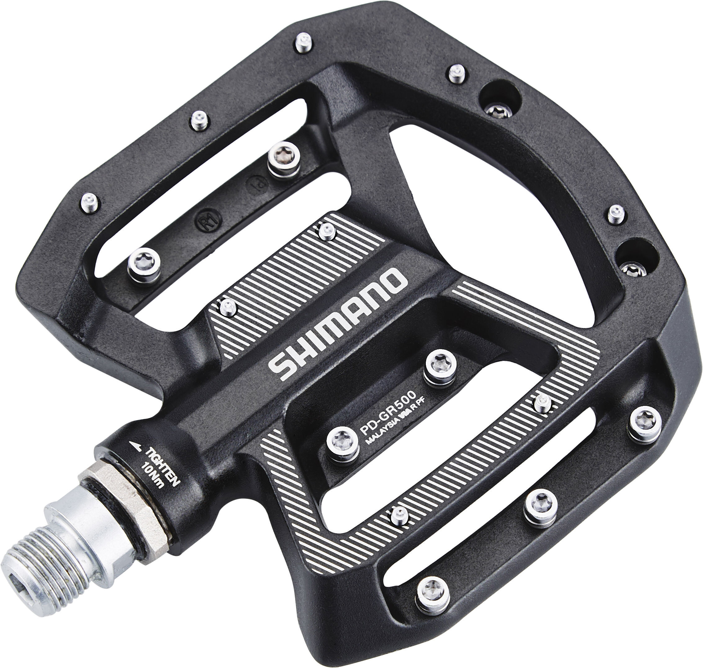 PD-GR500 platformska pedala tvrtke Shimano dizajnirana je za korištenje na stazama i svim planinama i ima izvrstan omjer cijene i performansi. Ima devet po visini podesivih i izmjenjivih klinova po strani i, zajedno s konkavnom platformom, nudi vrlo dobro prianjanje i veliku udobnost na i izvan staze.
